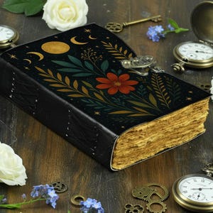 🌑 Features: • Genuine leather cover with detailed raven and moon artwork • Antique brass lock to secure your secrets and spells • Golden deckle-edged paper with a hand-aged, vintage look • Hand-stitched binding for durability and timeless charm • Aesthetic gothic border design for added drama and depth