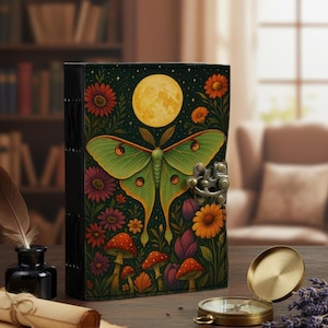 Embrace the mystical energy of transformation and nature with this enchanting Luna Moth Journal. Adorned with moon phases, wildflowers, and a celestial green moth, this handcrafted leather-bound journal is the perfect magical companion for witches, dreamers, and nature lovers.