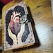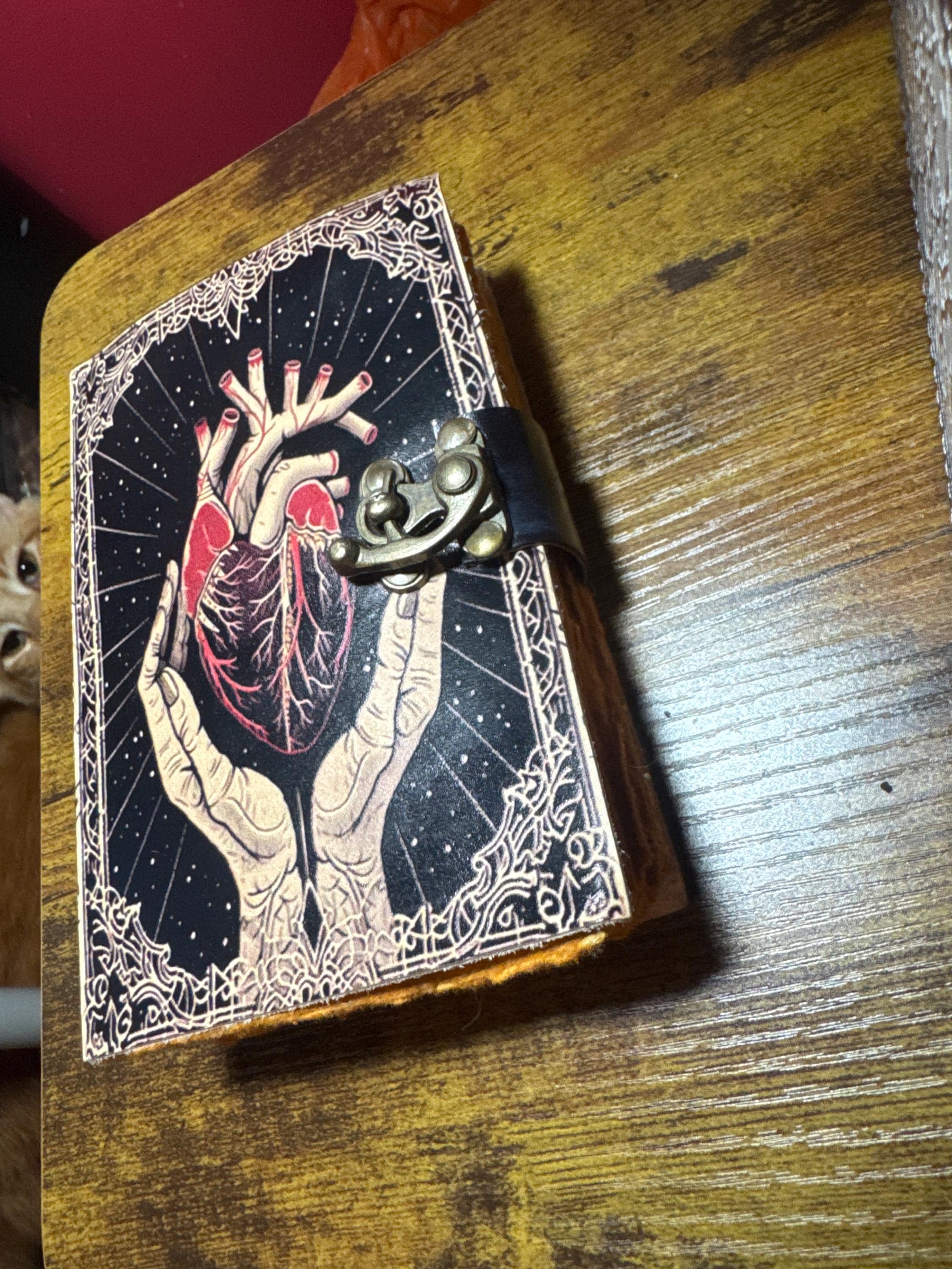 Step into the world of mystery and magic with this handcrafted leather journal, featuring an intricate anatomical heart design framed by mystical hands and ornate gothic borders. Perfect as a spellbook, grimoire, or personal diary, this unique notebook combines dark elegance with functionality.