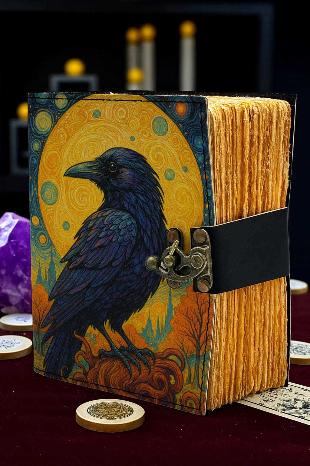 Crafted from premium full-grain leather, this journal features a striking raven design embossed against a glowing moon — symbolizing wisdom, transformation, and inner power.
