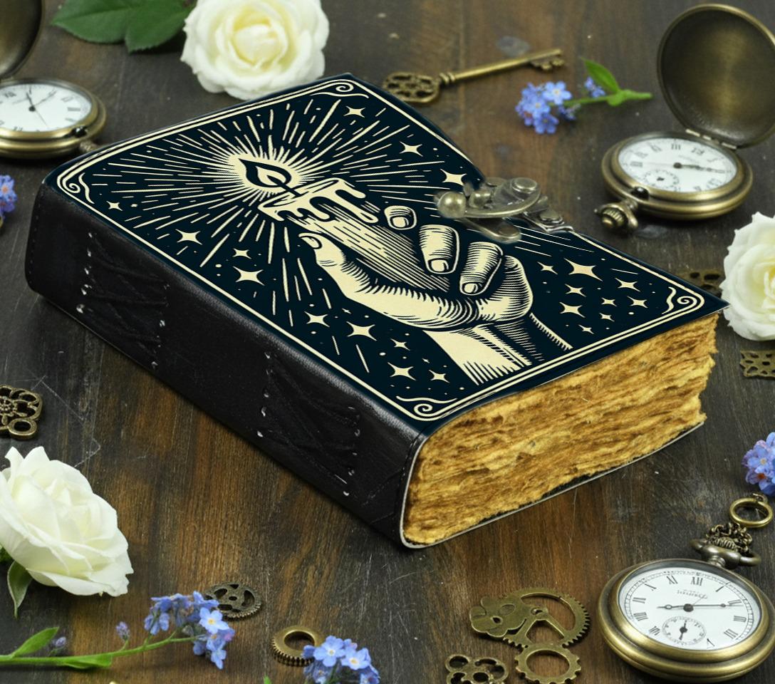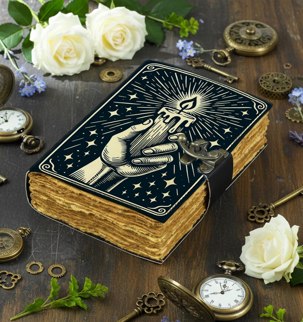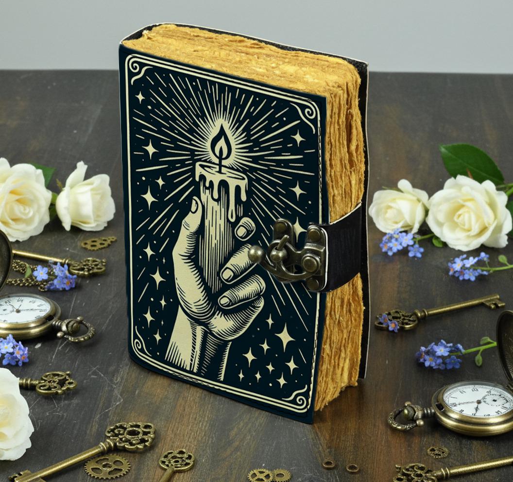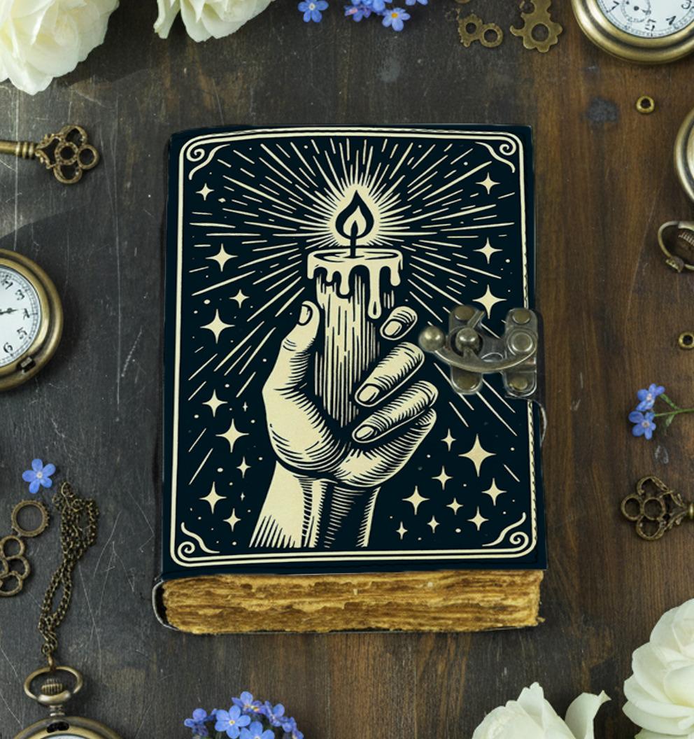 Illuminate your thoughts and awaken your inner magic with this Handmade Leather Journal, beautifully embossed with a hand holding a candle — a symbol of guidance, light, and knowledge.