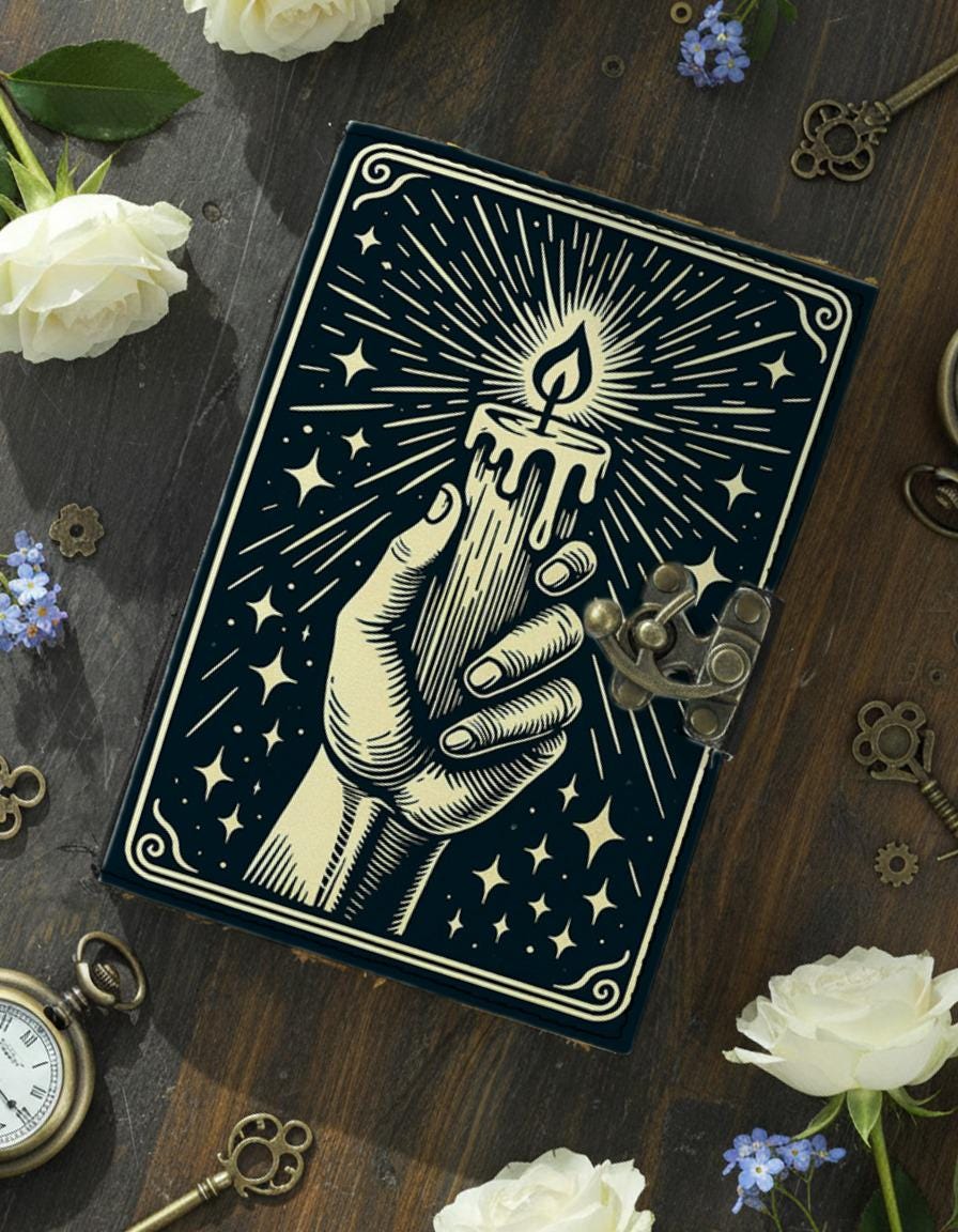 The intricate candle-and-hand design represents the flame of inspiration and spiritual awakening — making this piece perfect for journaling, sketching, or sacred writings.