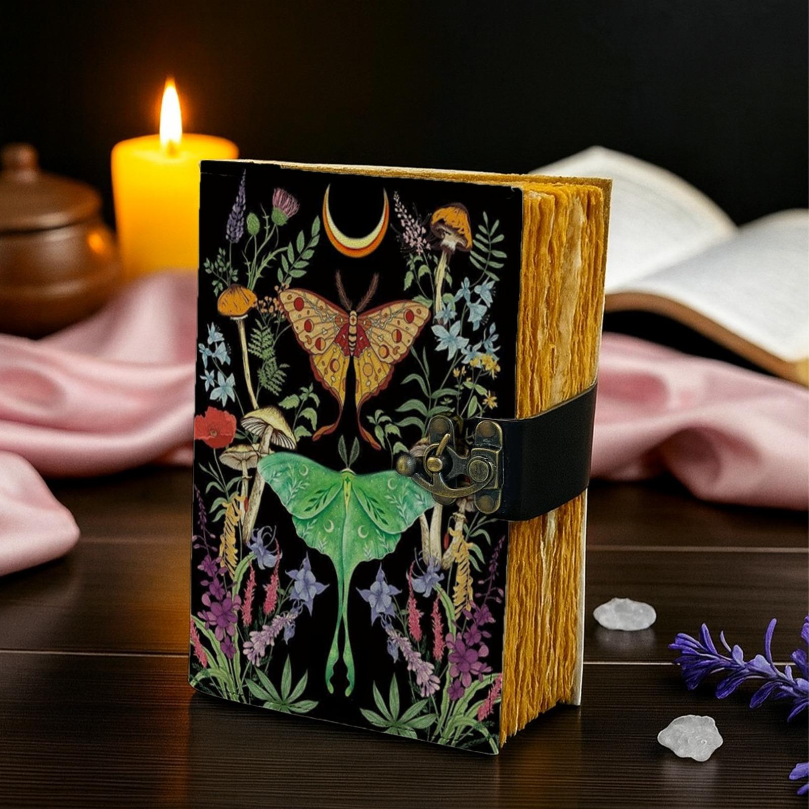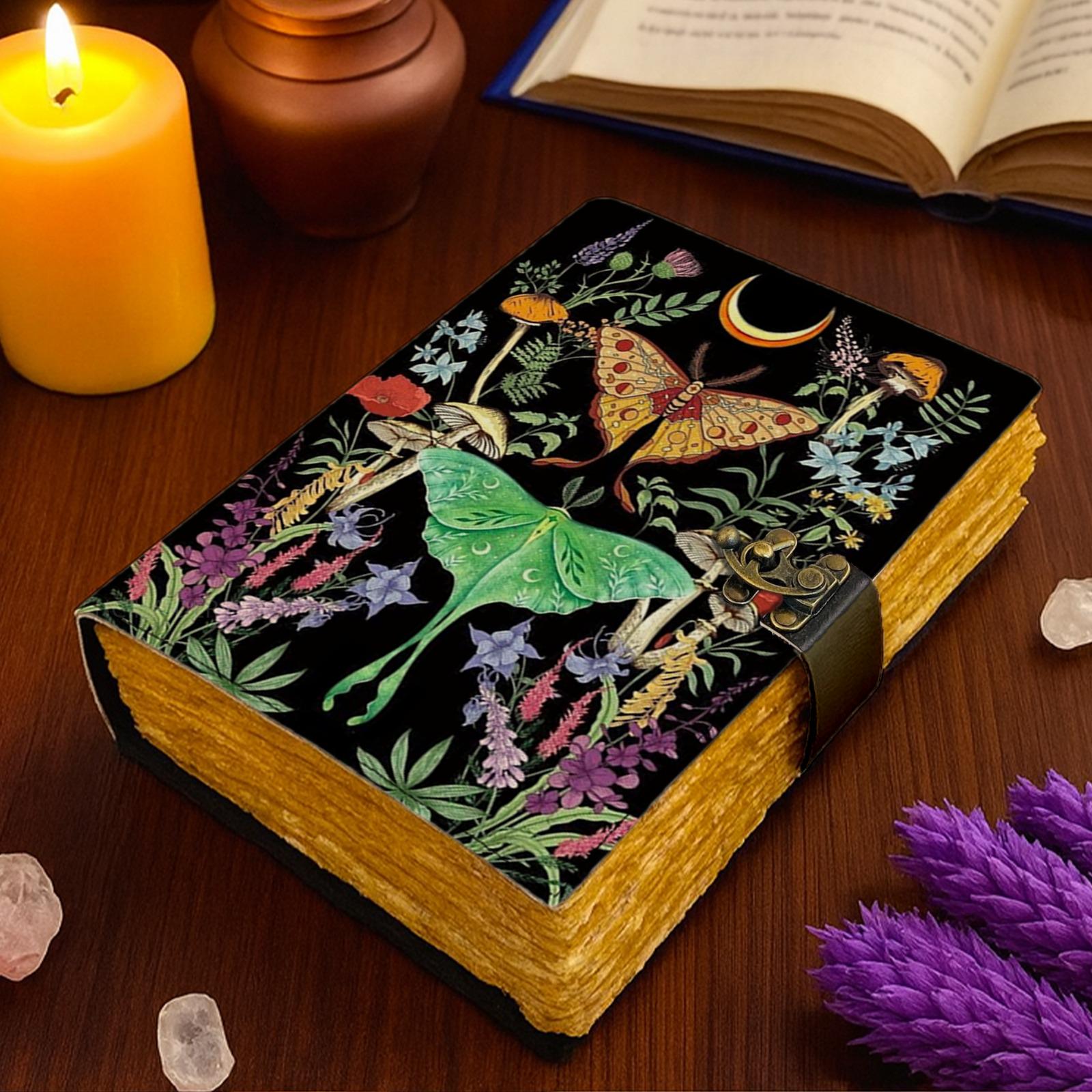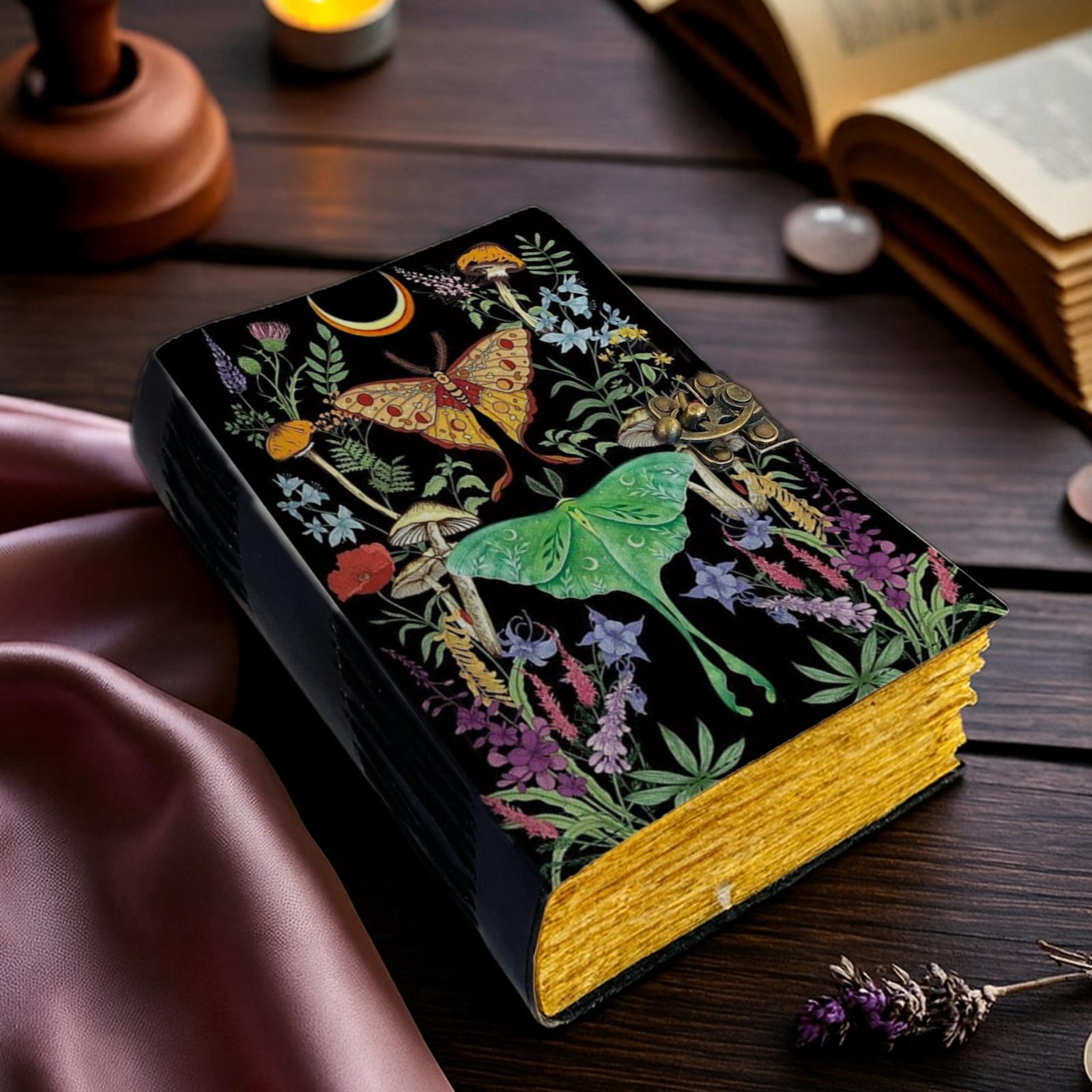 ๐๐ฆ Handmade Leather Luna Moth Journal with Lock โ Celestial Butterfly Grimoire, Botanical Spell Book & Vintage Writing Diary
