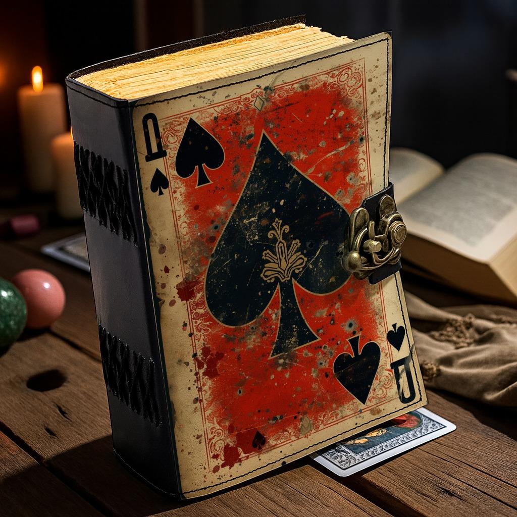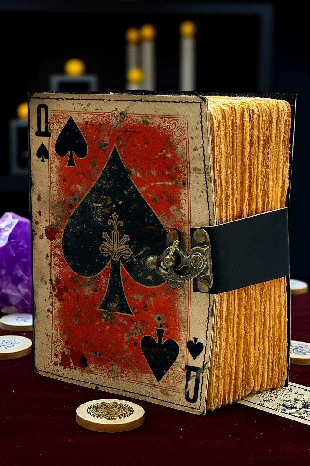 ace of spades journal, leather notebook, gothic diary, poker gift book, handmade grimoire, vintage spell book, artistic leather diary, playing card notebook, gothic journal, men’s writing gift, occult notebook, spade design book, vintage sketchbook