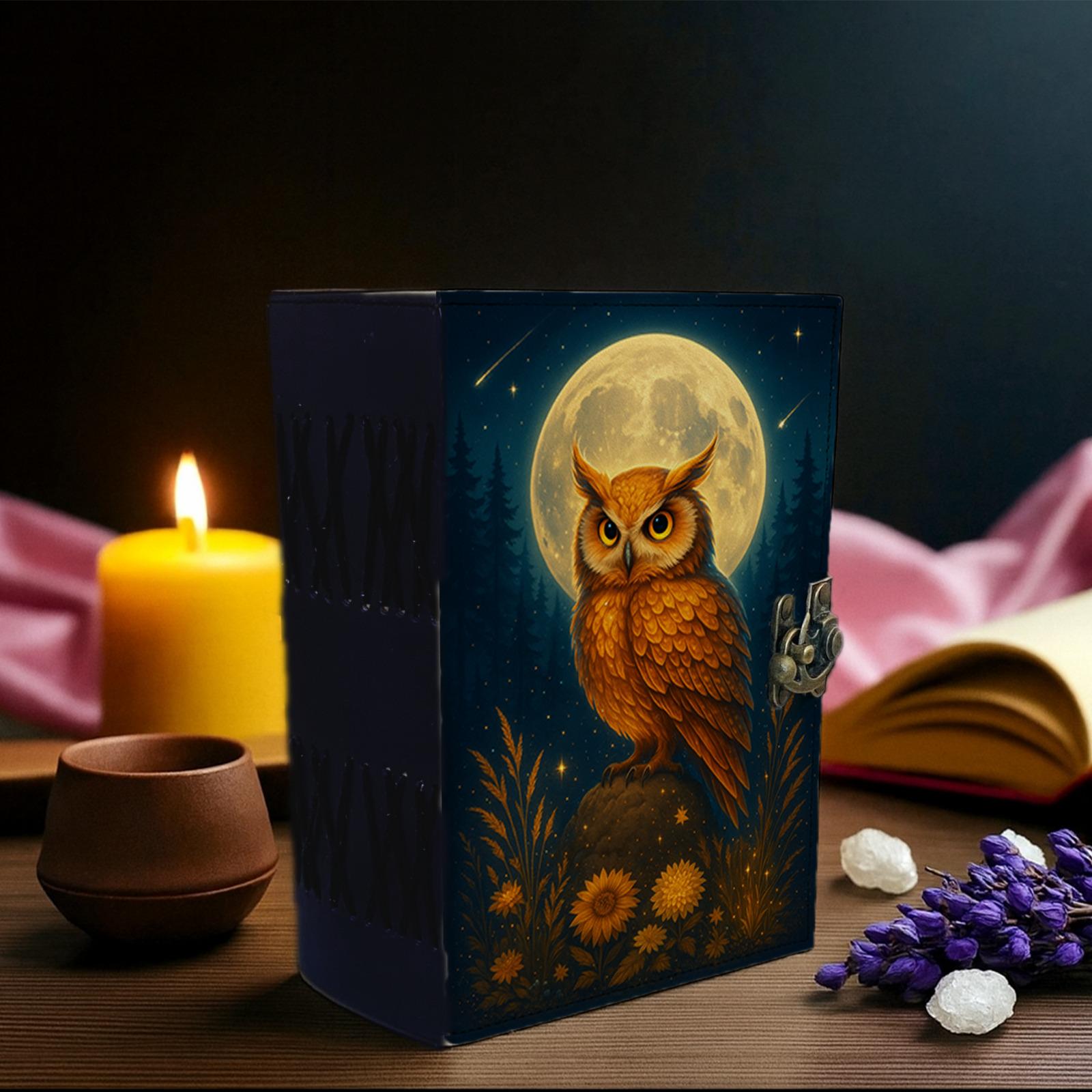 🌕 Owl and Full Moon Handmade Leather Journal – Mystical Grimoire Notebook with Lock