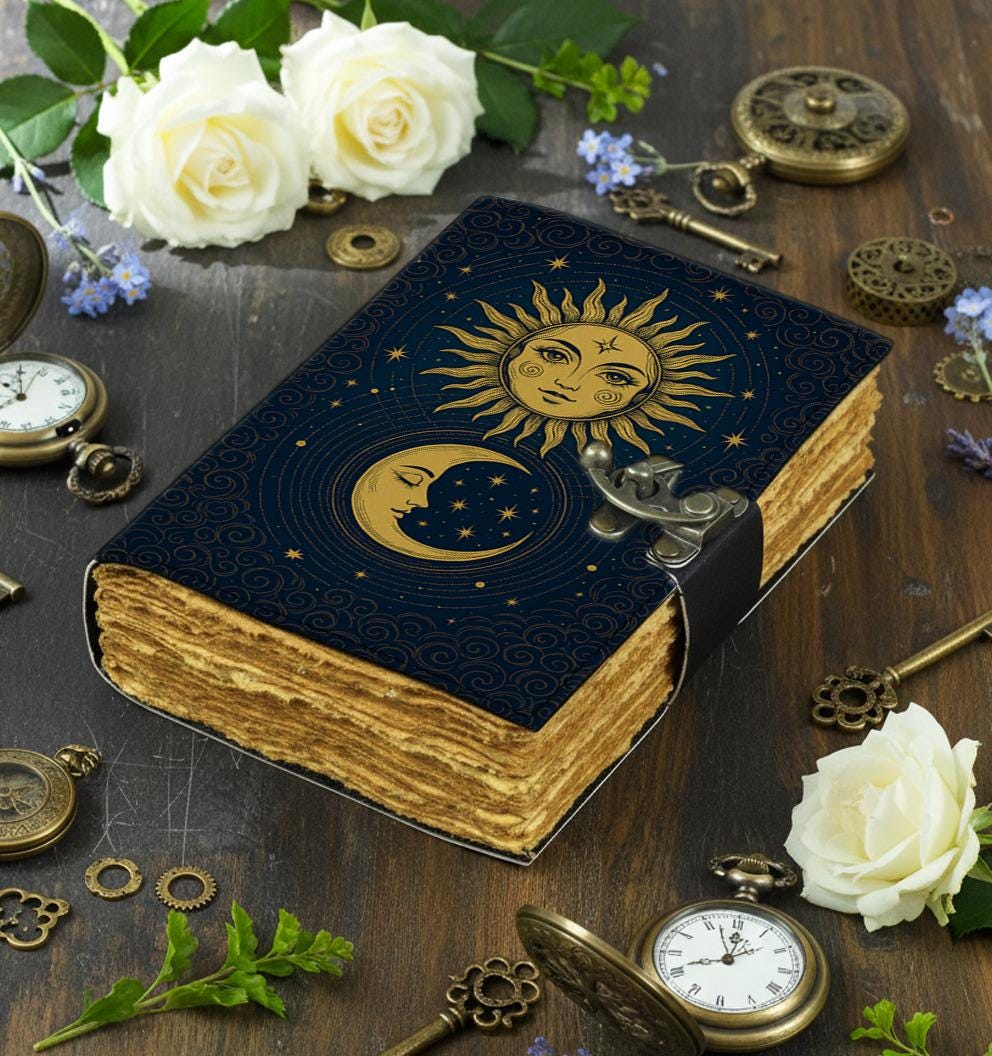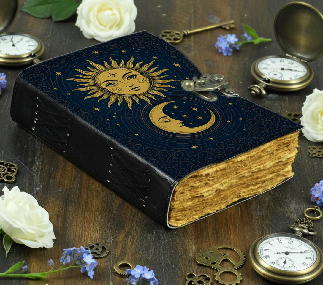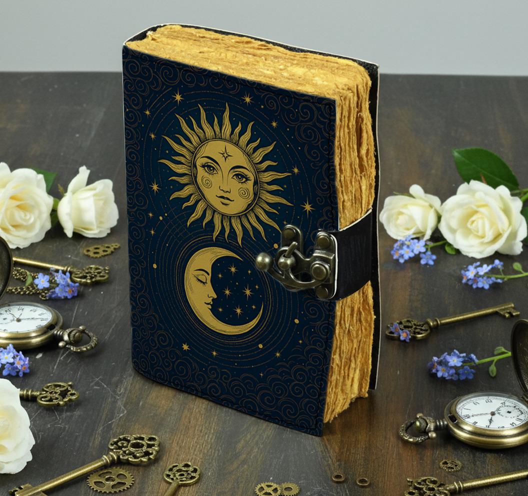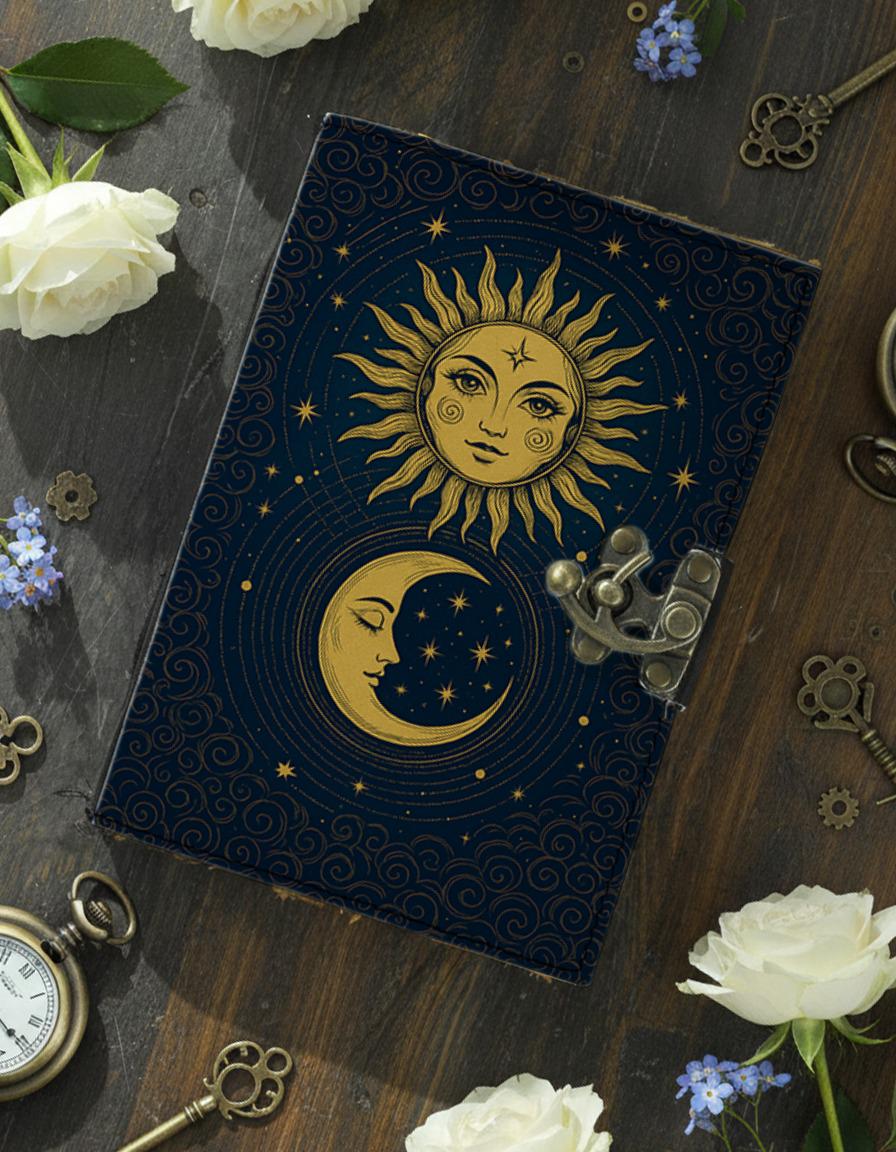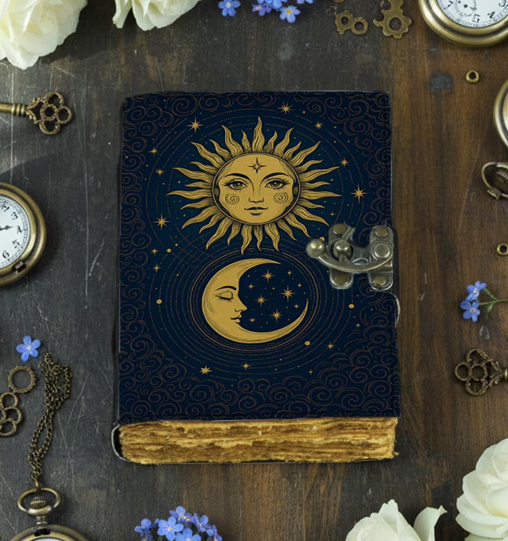 โ๏ธ๐ Sun and Moon Handmade Leather Journal โ Celestial Grimoire Notebook with Lock