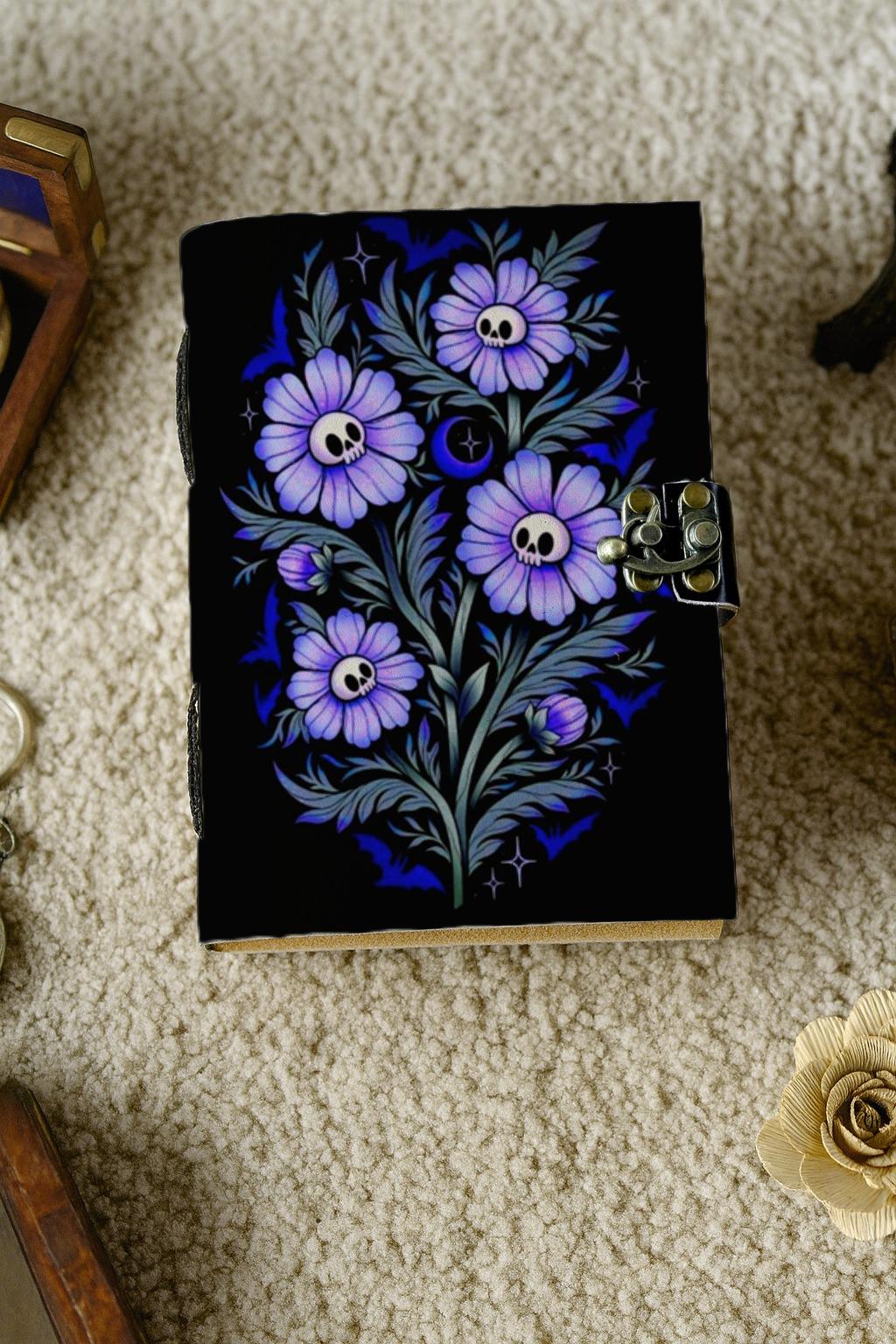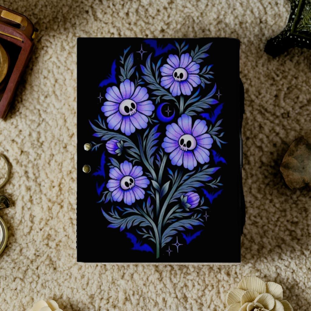 Embrace the beauty of darkness and bloom with this mesmerizing handmade leather journal, featuring a stunning design of violet skull flowers intertwined with silver-blue leaves. Symbolizing the unity of life, death, and rebirth, this piece is a must-have for lovers of gothic art, witchcraft, and dark romance.