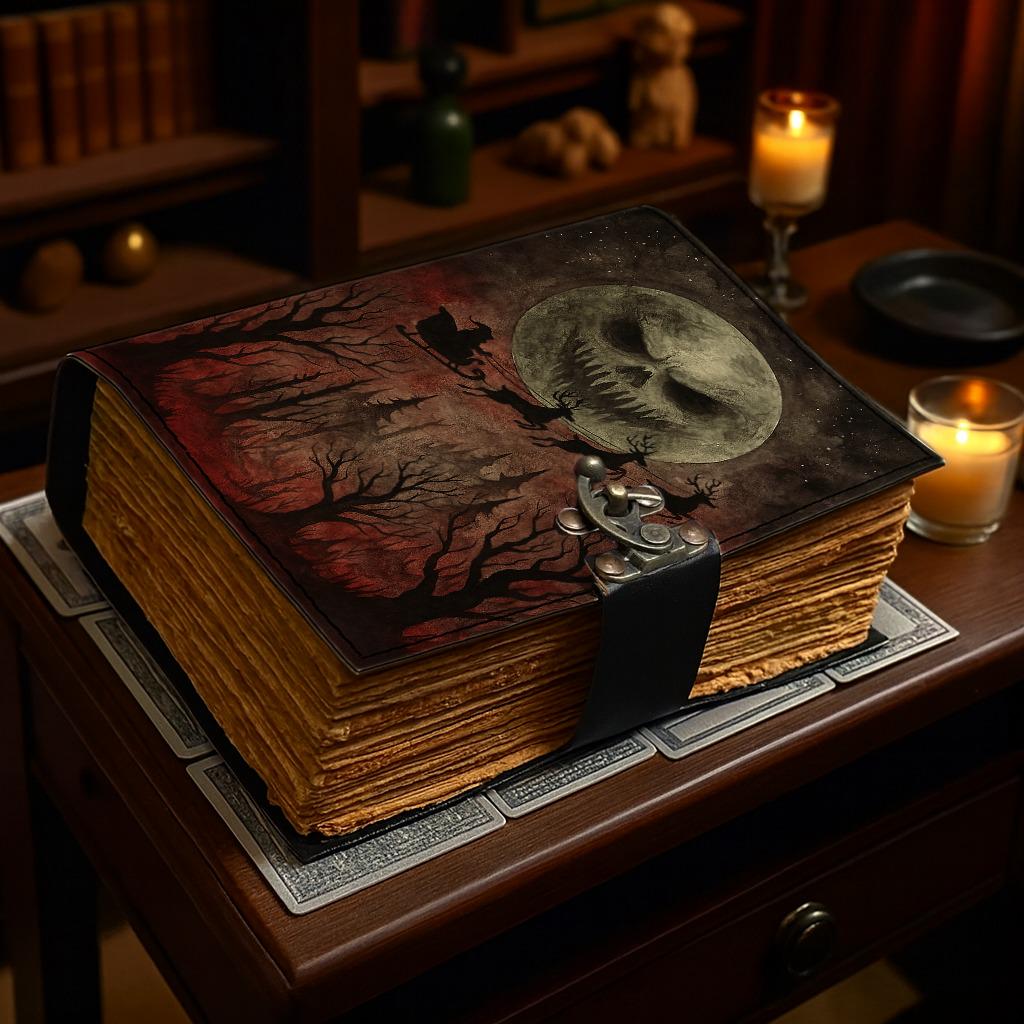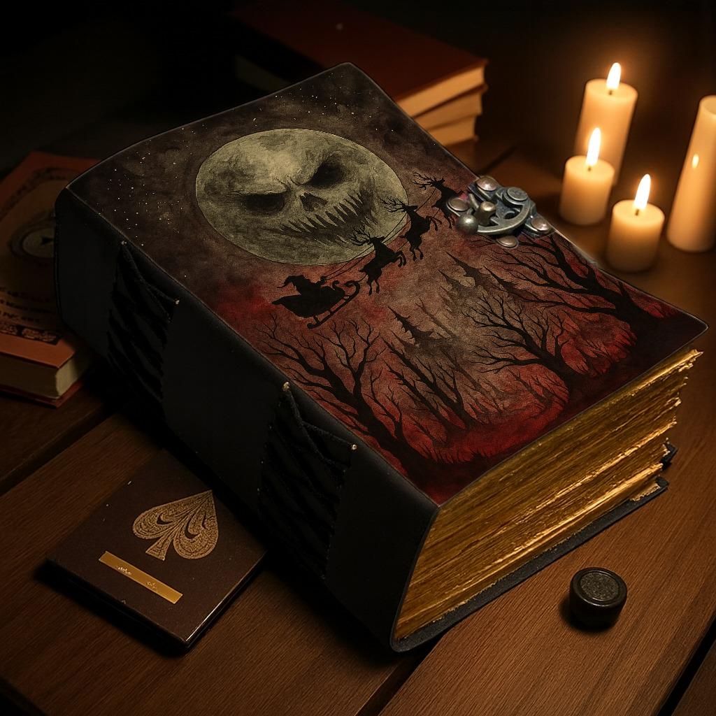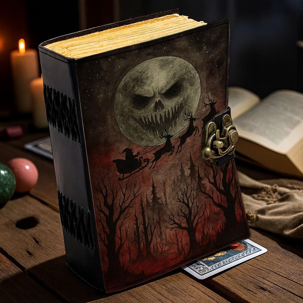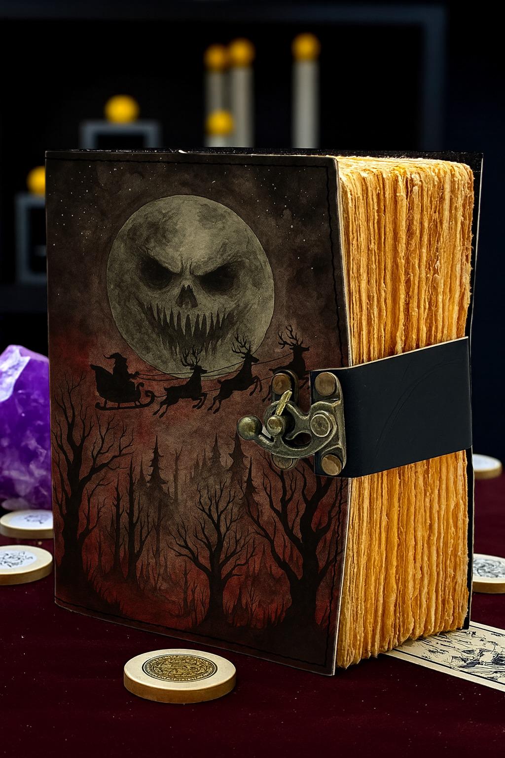 Enter a world where Christmas meets the mysterious — this Handmade Leather Gothic Journal features a haunting full moon with a chilling face watching over Santa’s shadowed sleigh soaring through a blood-red forest night. Perfect for those who love the fusion of dark fantasy, gothic art, and eerie holiday magic, this piece turns every page into a story waiting to be written.